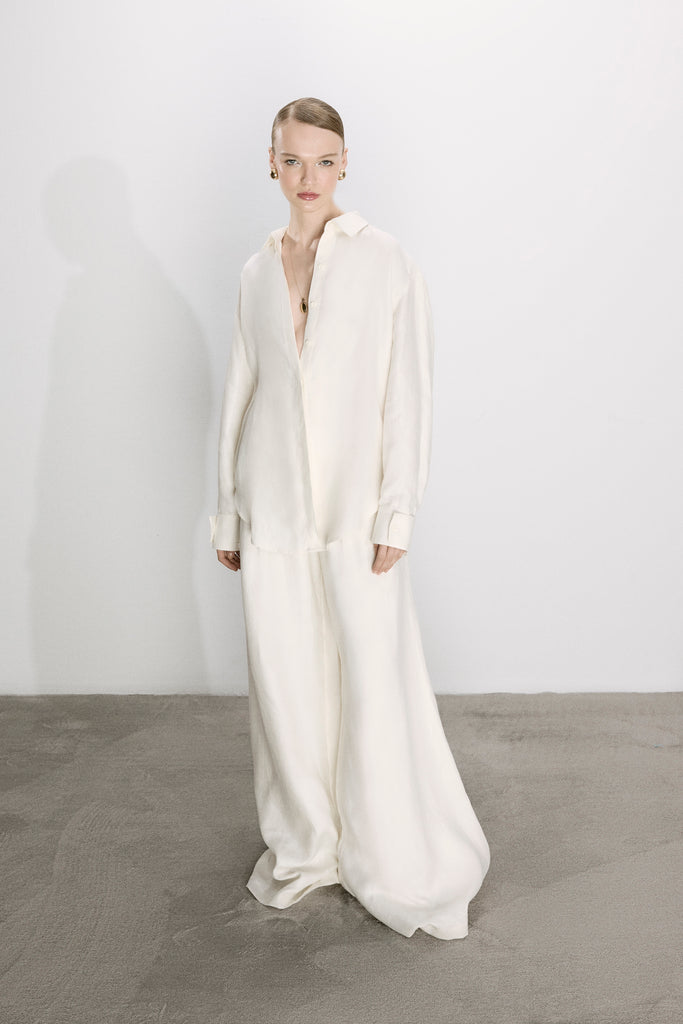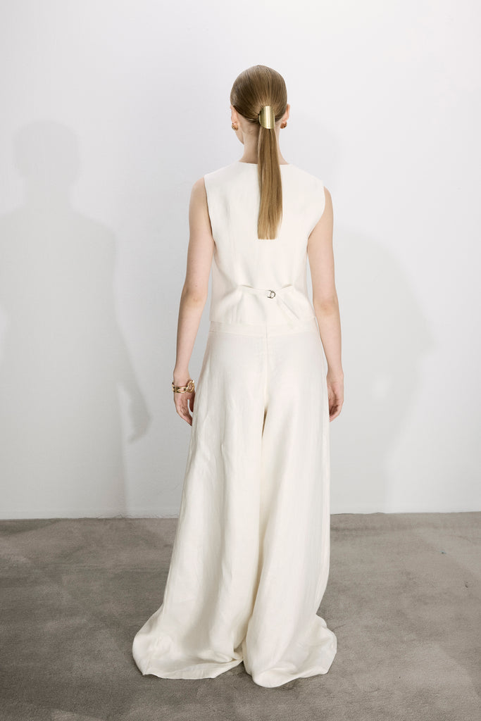 Mui Keten Pantolon, geniş paçalı, yandan gizli fermuar ile tamamlanmıştır. Brita Keten Yelek, Marona Top yada Ravenna Keten gömlek ile kombinlenebilir.