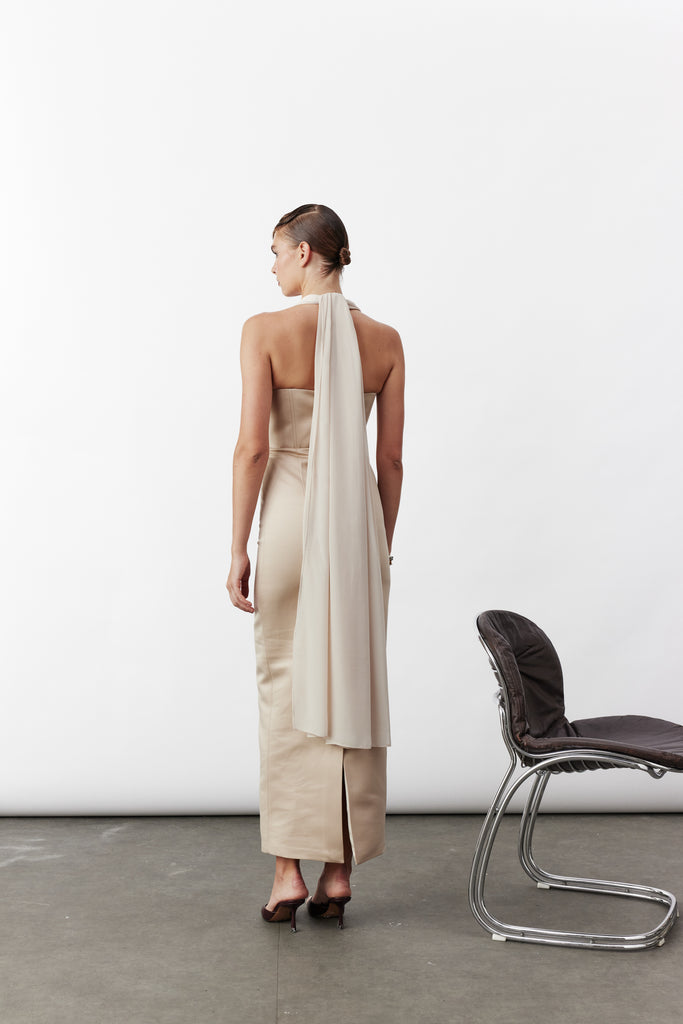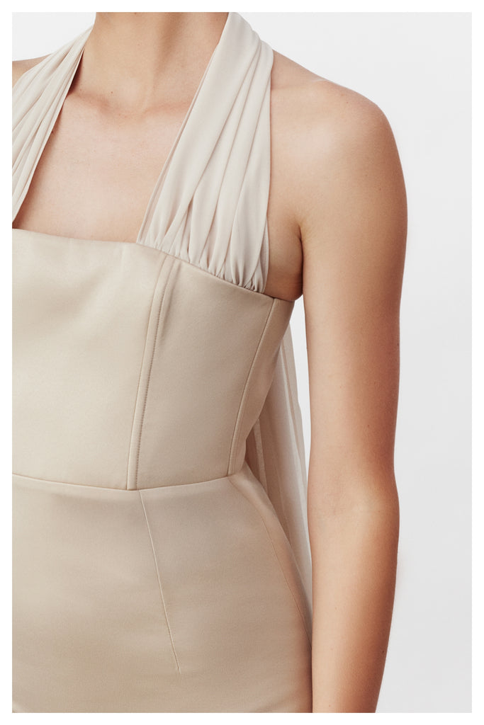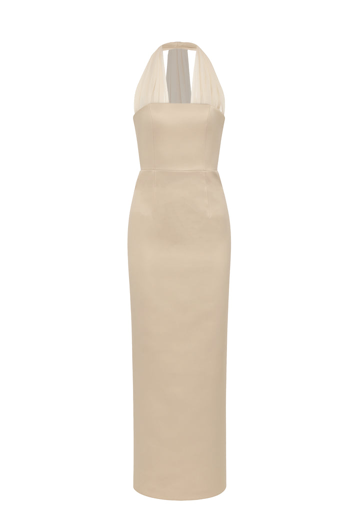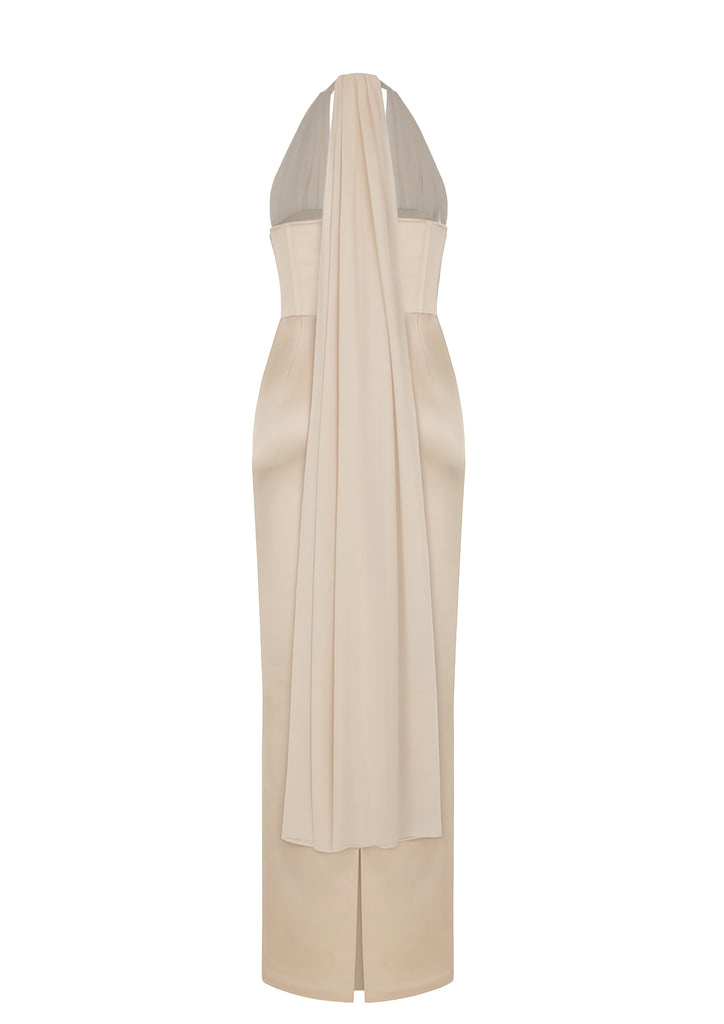 Clarine Uzun Elbise, korse formundaki üst kısmı ve boyundan bağlanan şifon detayıyla zarif bir silüet sunar. Üst gövdesi kendi kumaşından iki kat tasarlanmış, etek kısmı ise saten astarla astarlanmıştır. Vücudu saran yapısı ile gövdesi mat saten kumaştan üretilen elbise, arkadaki yırtmaç detayıyla hem şıklık hem de hareket özgürlüğü sağlar.