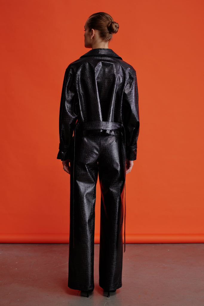 Krokodil desenli Millie Deri Pantolon, düz kesimi ve yan cepleriyle modern bir duruş sunarken, ceketiyle kombinlendiğinde zarafeti bir üst seviyeye taşıyor.
