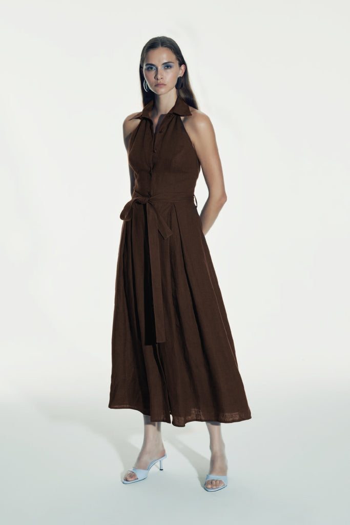 Bu etkileyici Carrie elbise, şık tasarımı ve kahverengi keten kumaşıyla öne çıkıyor. Önü düğmeli detayıyla zarif bir görünüm sunan bu elbise, belindeki kuşak ile vücuda hoş bir şekil veriyor. Kahverengi rengi, doğanın sıcaklığını ve zarafetini yansıtırken, keten kumaşı ise rahatlık ve dayanıklılık sunuyor. Hem günlük kullanımda hem de özel davetlerde şıklığınızı ön plana çıkaracak bu elbiseyle her zaman kendinizi özel hissedeceksiniz.