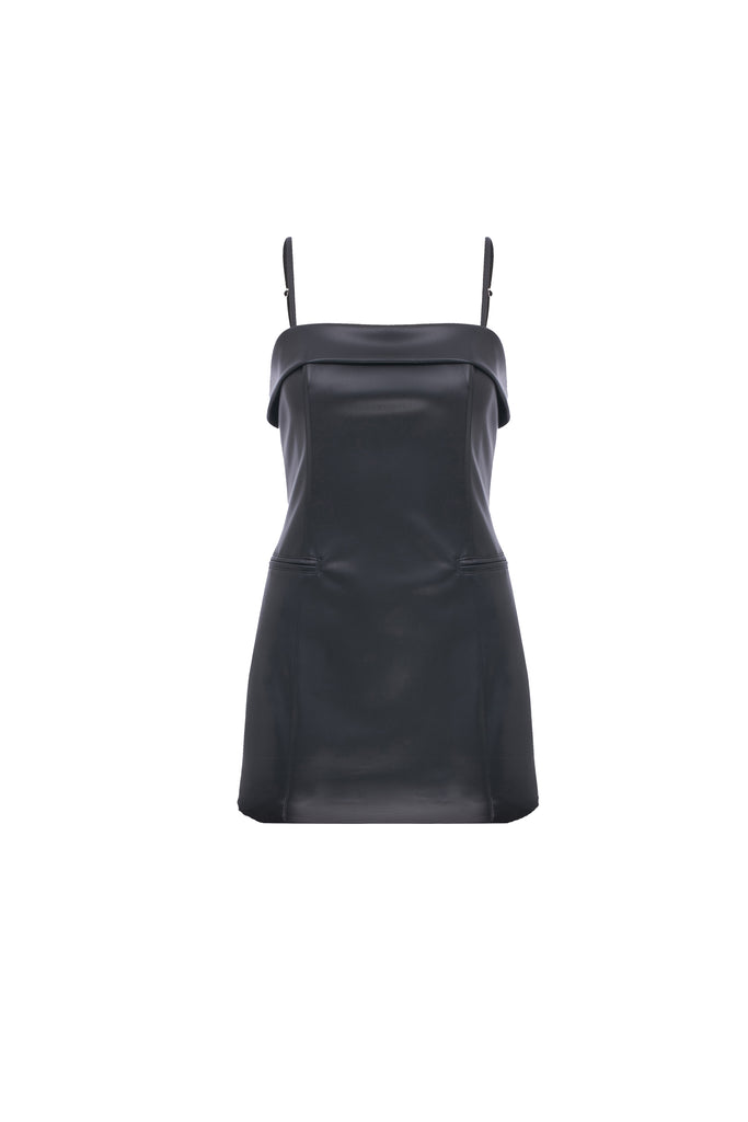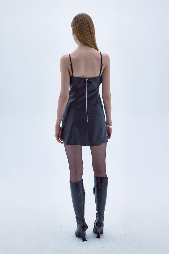 Yumuşak vegan deriden üretilen bu mini elbise, içi saten astarlı ve arkada sağlamlık için metal fermuara sahip. Şık ve zarif yapısıyla özel günler için ideal bir alternatif sunar. Boxy Kısa Ceket ile kombinlendiğinde modern bir görünüm sağlar.