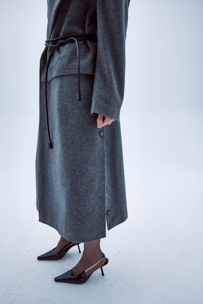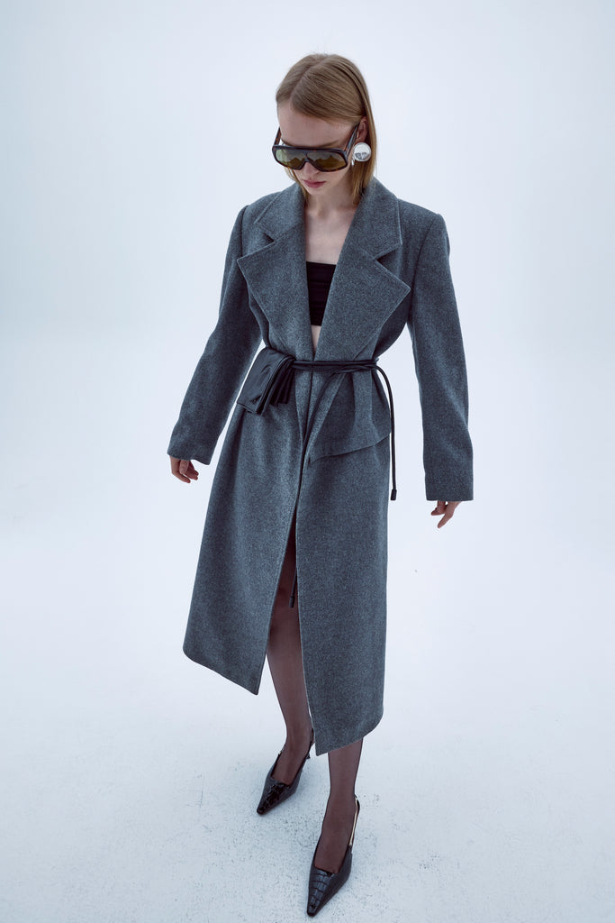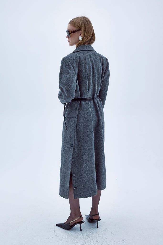 Nazlı Ceren’in antrasit tonundaki Isha Kabanı, hafifçe oversize bir siluete sahiptir ve modern bir dokunuş için tek tarafında asimetrik parçaya sahiptir. Şık vatkalı omuzu ile konfor ve stili bir araya getirir.