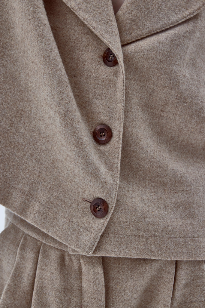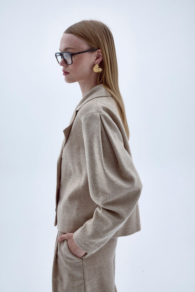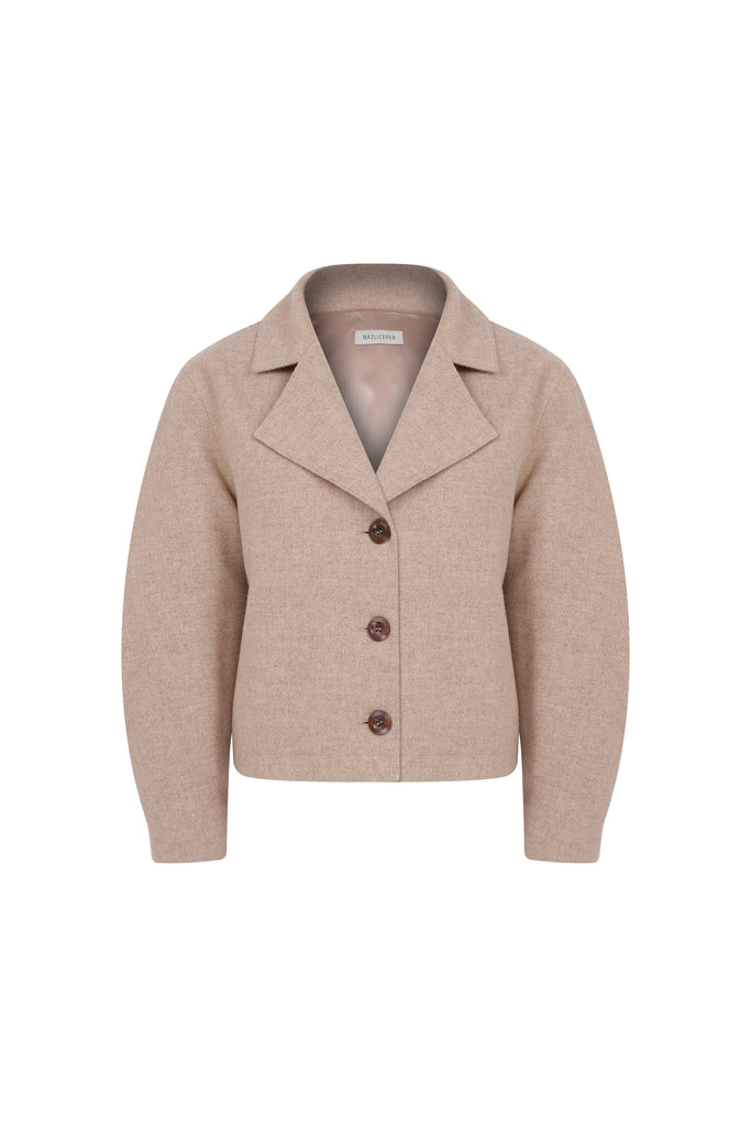Kai Ceket, bej renginde yünden üretilmiştir. Hafifçe abartılı ve kavisli omuzlara sahiptir.