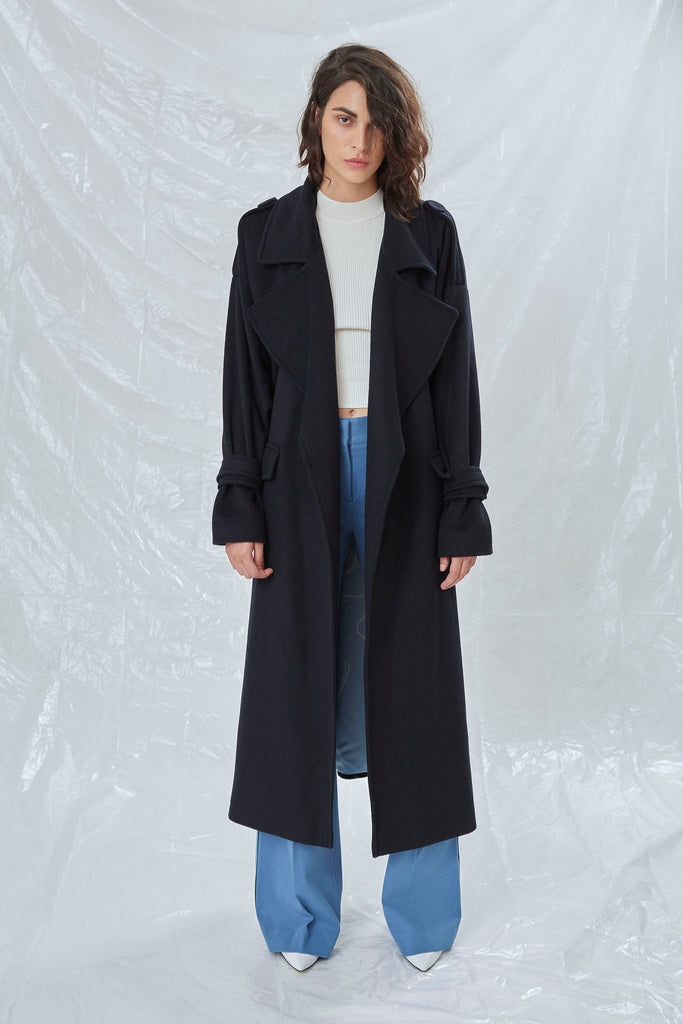 Laura palto yün ve kaşmir karışımından üretilmiştir. Geniş yakaları ve vatkalı omuzlarıyla uzun bir silüet oluşturarak modern ve minimal bir görünüm elde ediyor.