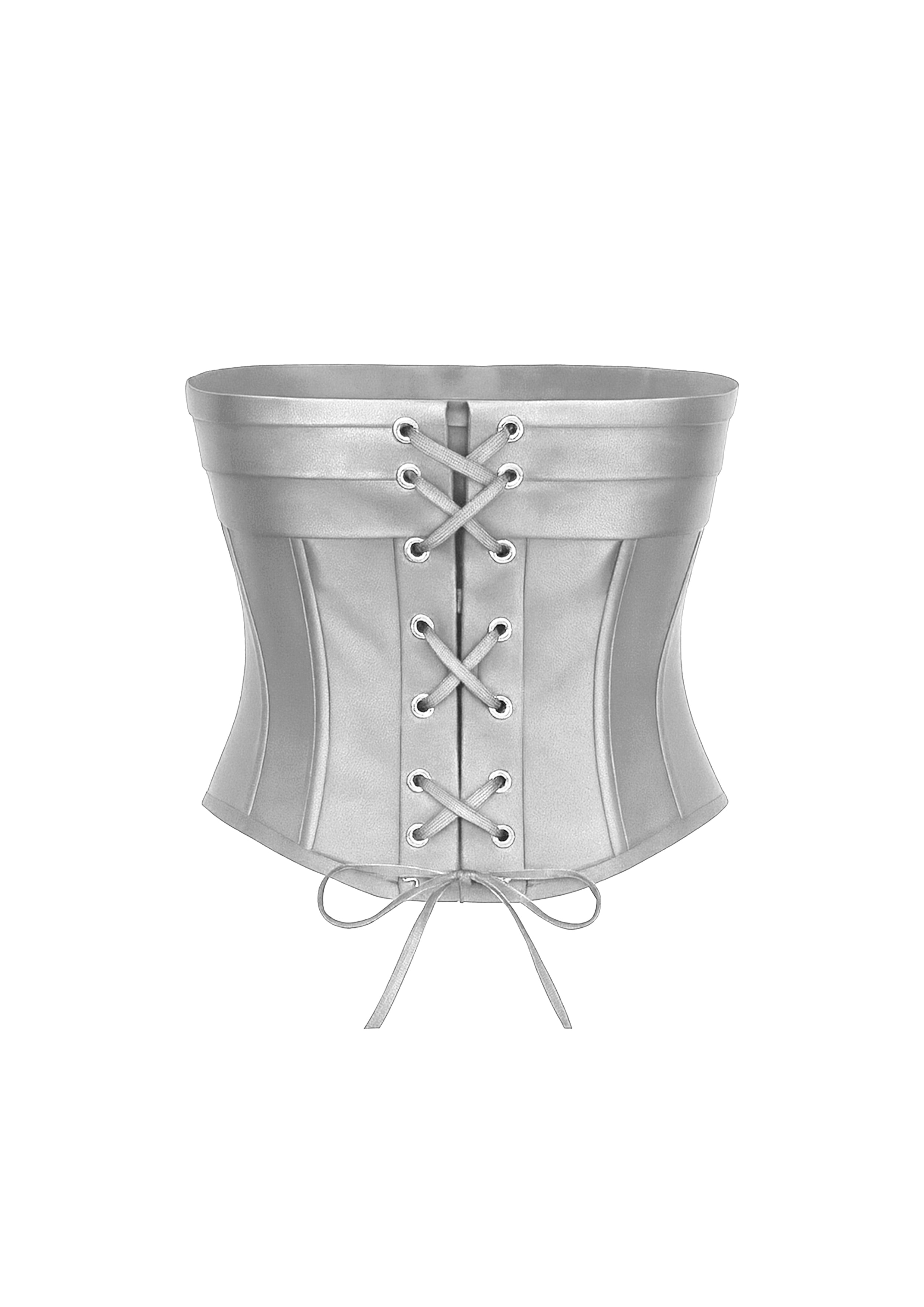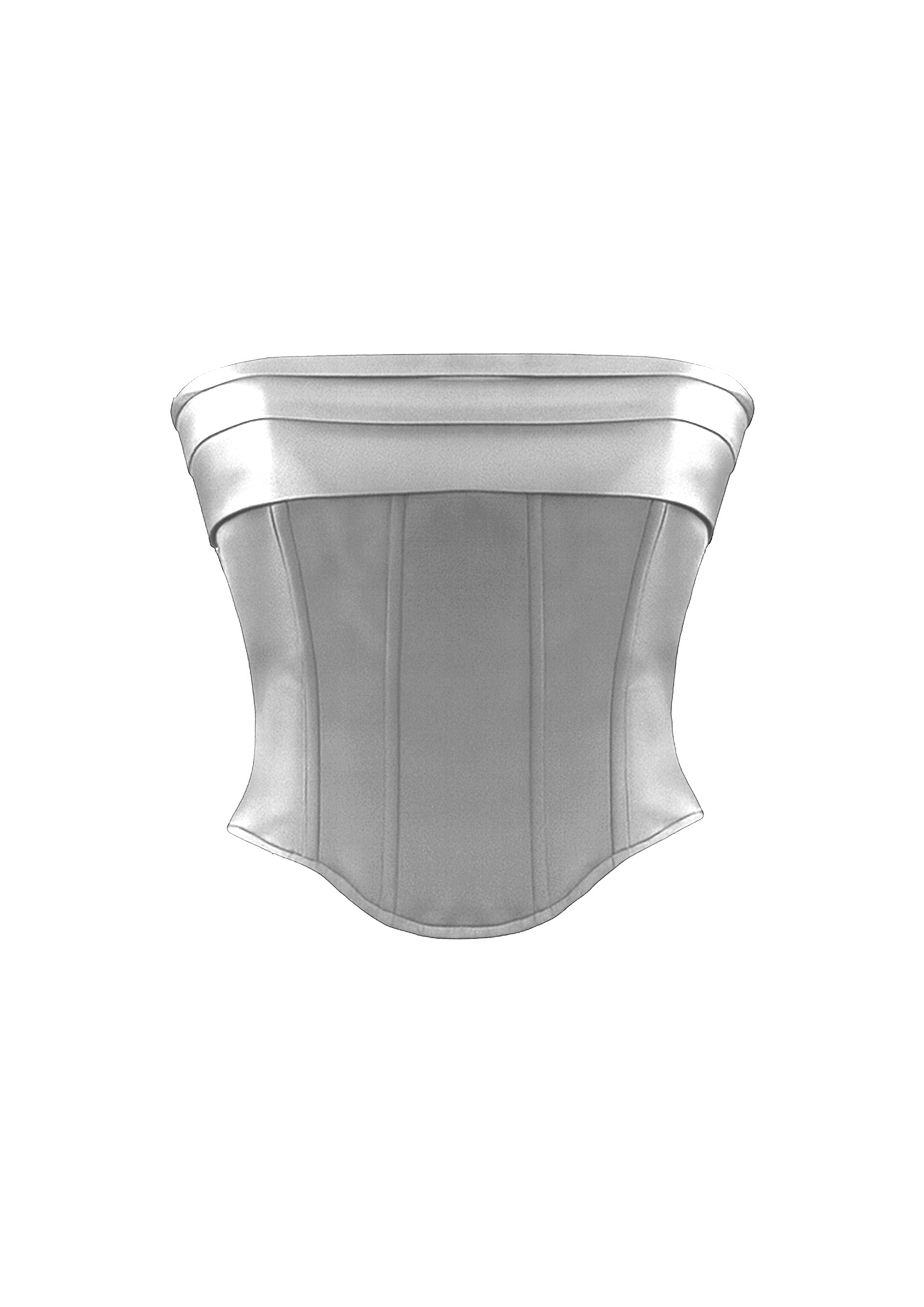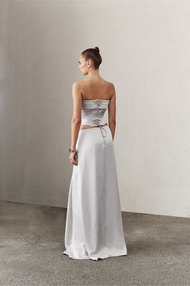 Bridget Korse, gümüş tonunda saten kumaştan üretilmiştir. Panelli dikişlerle şekillendirilmiş yapısı sayesinde vücuda oturan bir silüet sunar. Straplez tasarım, kıvrımlı yaka detayıyla tamamlanırken, arka kısmındaki bağcık hem ayarlanabilirlik hem de zarif bir dokunuş katar. Hem gece stilleri hem de modern takımlar için kullanılabilecek çok yönlü bir parçadır. Corinne Etek ile kombinlenmiştir.