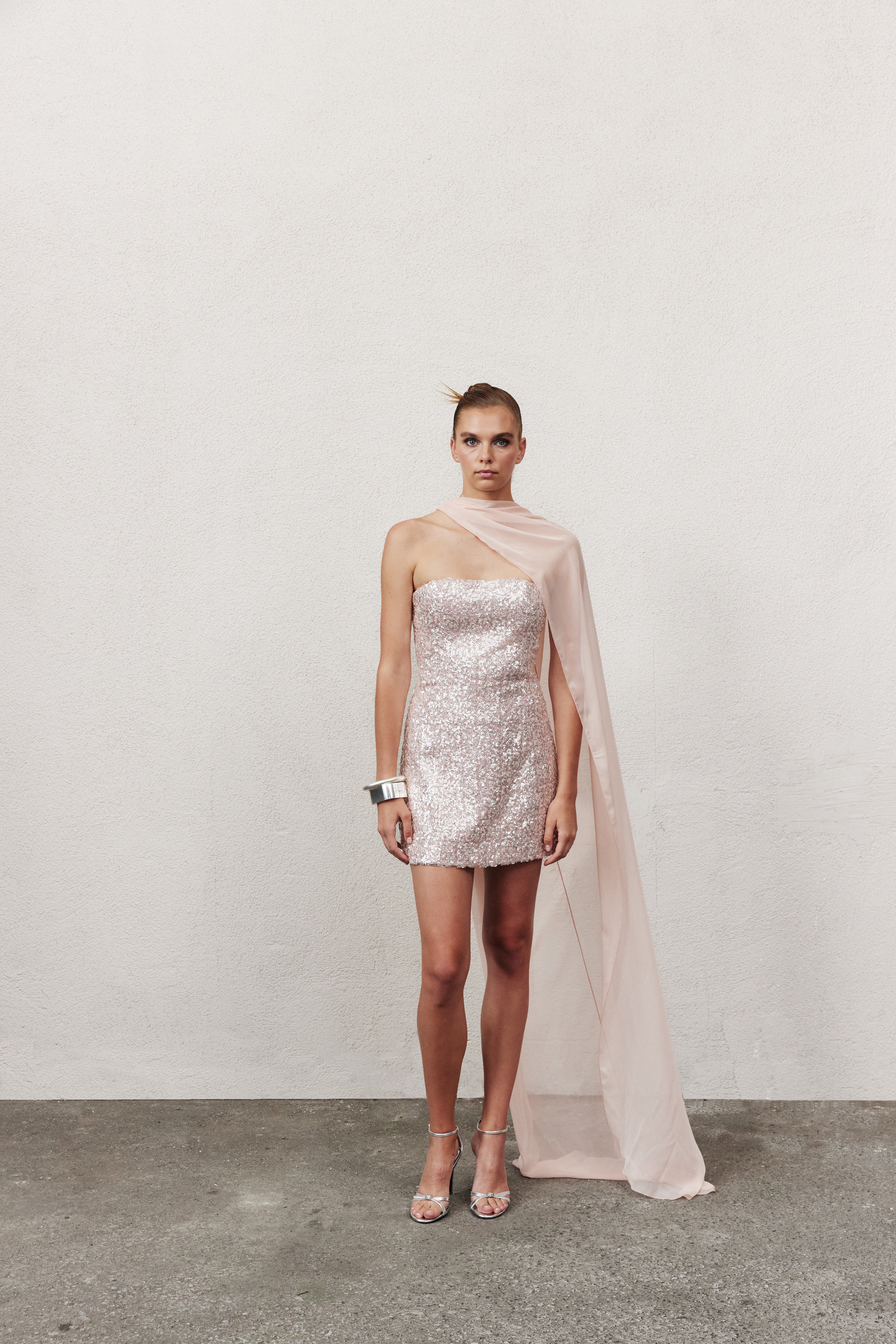 Casey Straplez Mini Elbise, pudra pembe payet kumaşıyla modern bir zarafet sunar. Tamamen saten astarlı ve hafif vücuda oturan siluetiyle hem rahatlığı hem de şıklığı bir arada sunar. Gizli arka fermuar detayıyla tamamlanan bu model, özel davetler için feminen ve sofistike bir seçimdir. Siyah rengi de mevcuttur.