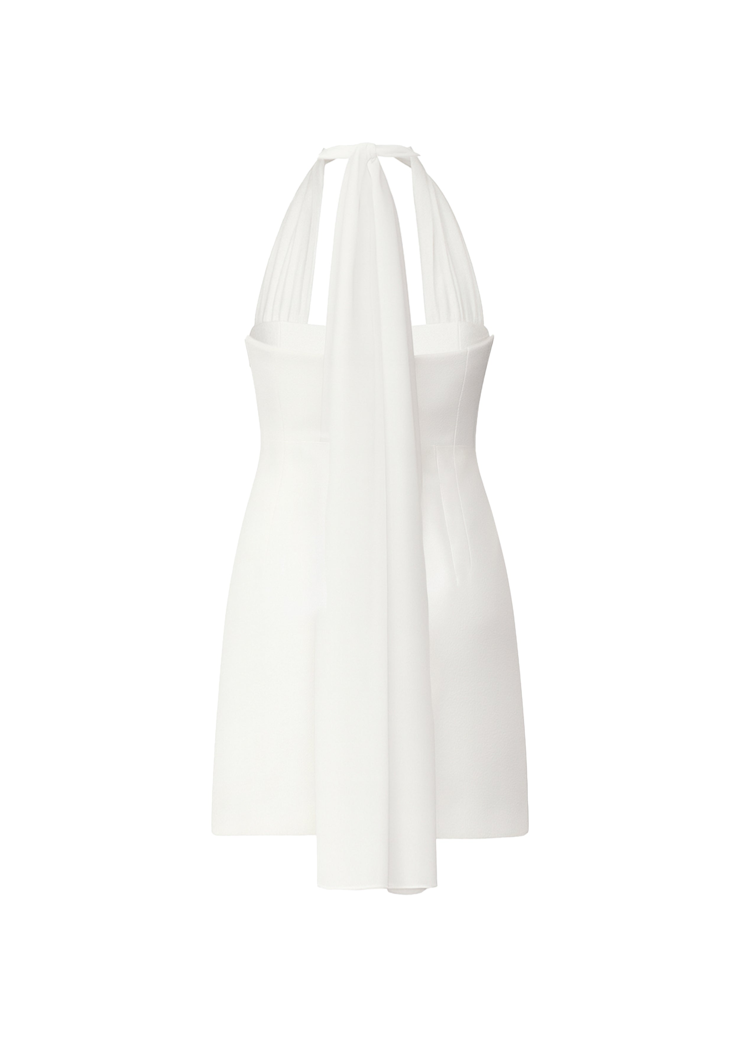 Clarine Mini Elbise, mat saten kumaştan üretilmiştir ve boyundan bağlanan uçuşan şifon askılarla tasarlanmıştır. Vücuda oturan silüeti bedeni öne çıkarırken, saten ve şifonun yumuşak kontrastı romantik ve zarif bir dokunuş sunar. Şık davetler için zarif bir tercihtir.