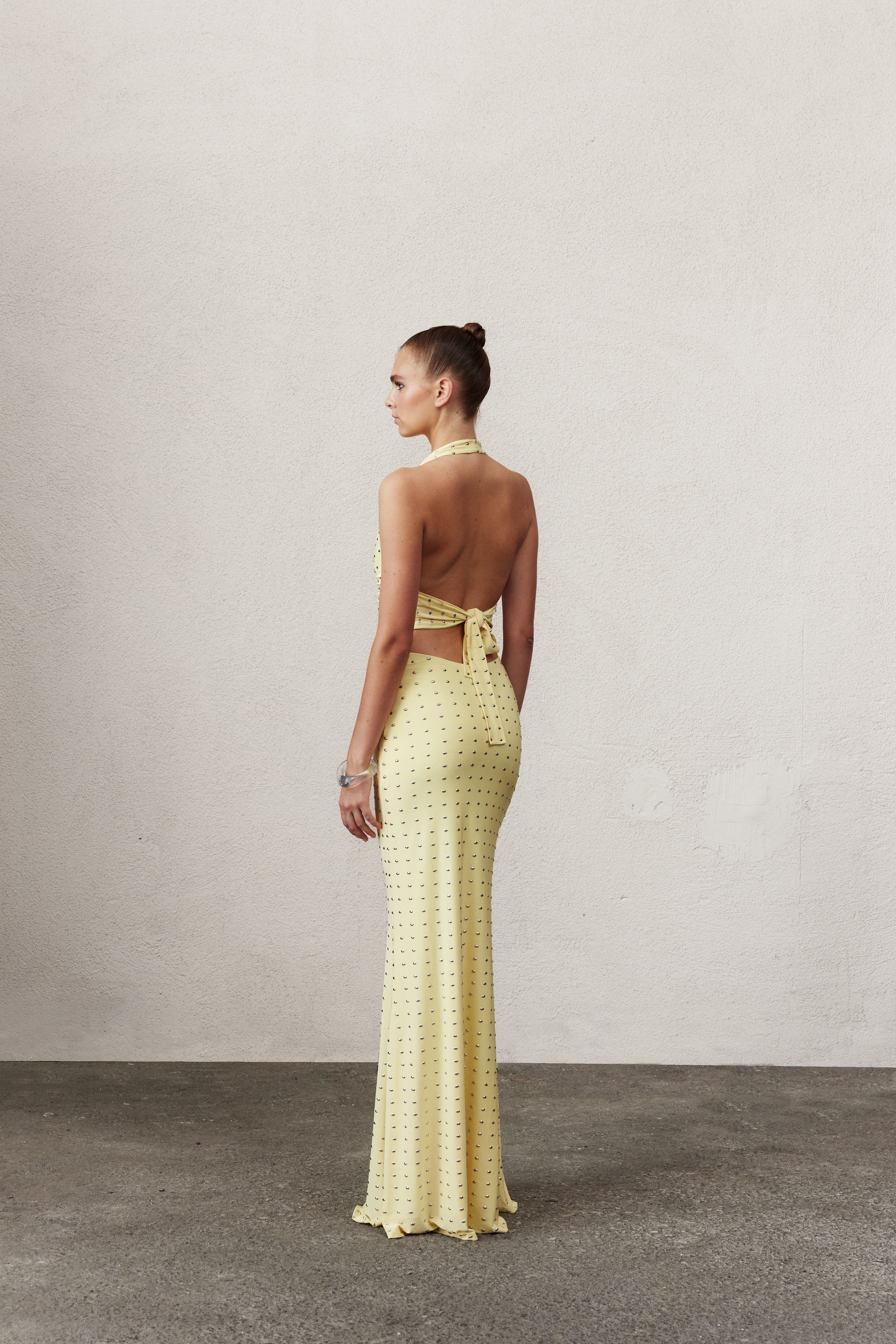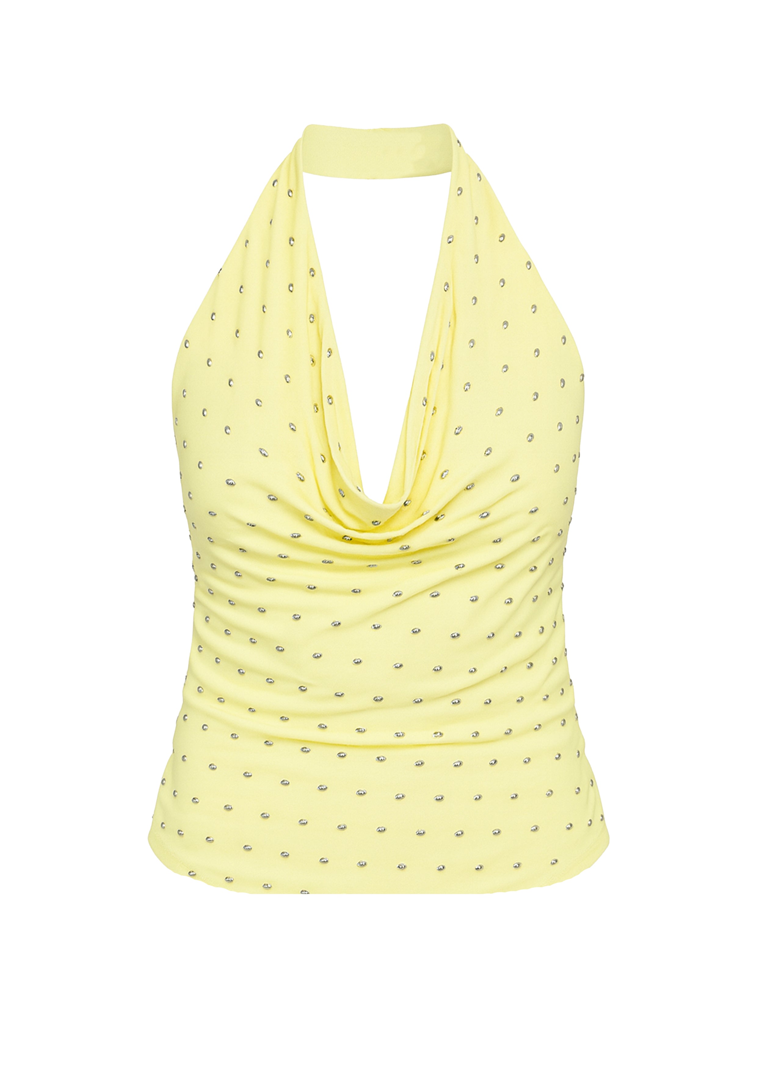 Franca Bluz, canlı sarı tonunda jarse kumaştan tasarlanmış olup degaje yaka ve bağlamalı açık sırt detayıyla öne çıkar. Kumaşın üzerine işlenmiş taş süslemeler, zarafeti modern ve eğlenceli bir dokunuşla buluşturur. Hem akşam görünümleri hem de şık gündüz kombinleri için ideal bir parçadır.