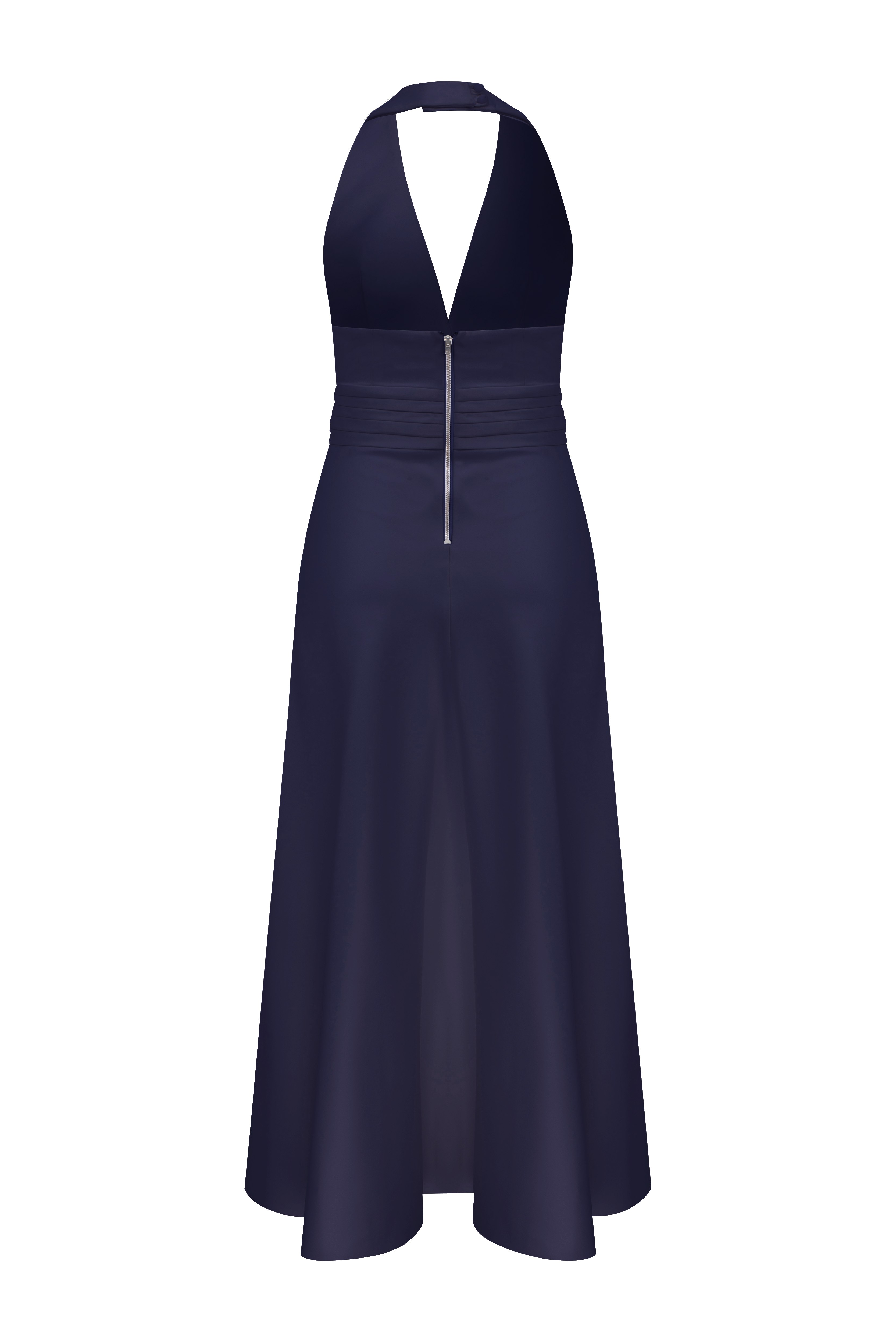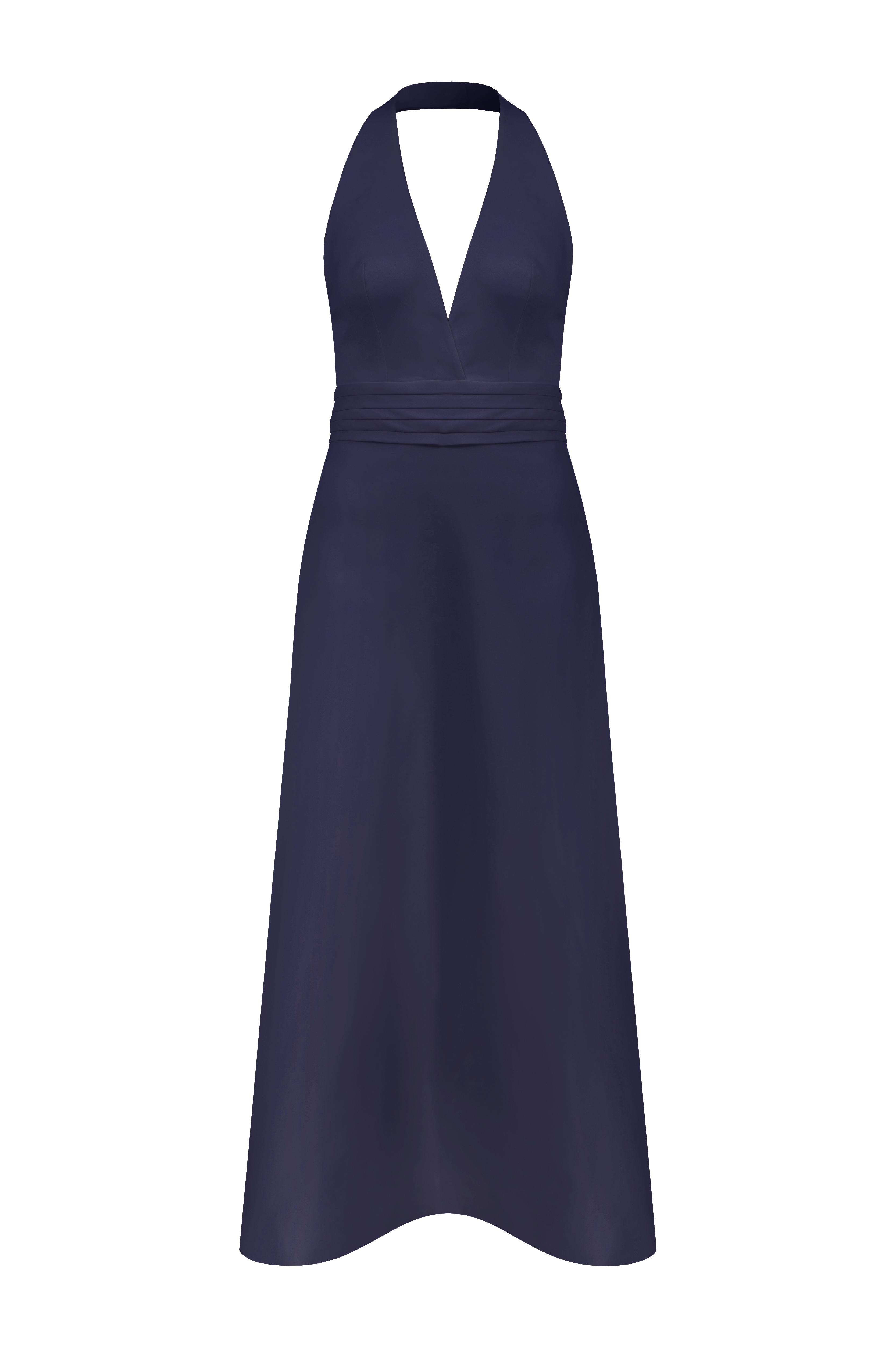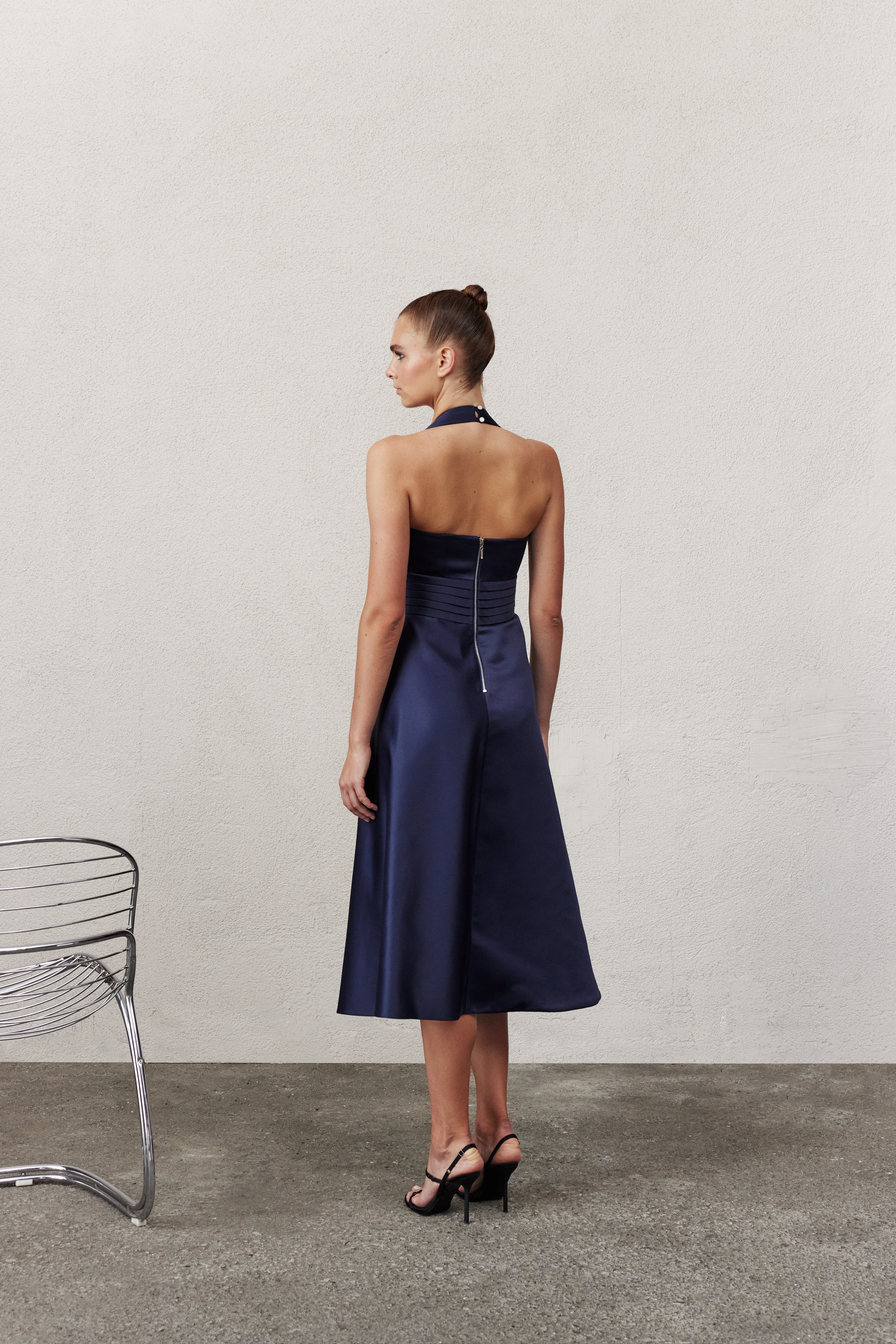 Lauryn Elbise, lacivert mat saten kumaştan üretilmiştir. Zarif bir şekilde omuzları öne çıkaran halter yaka detayıyla tasarlanmıştır. Vücuda oturan üst kısmı, bele eklenen zarif katlama detaylarıyla tamamlanarak silüeti vurgular. Akışkan kumaşı ve sade çizgileriyle gece davetleri için şık bir seçenektir.