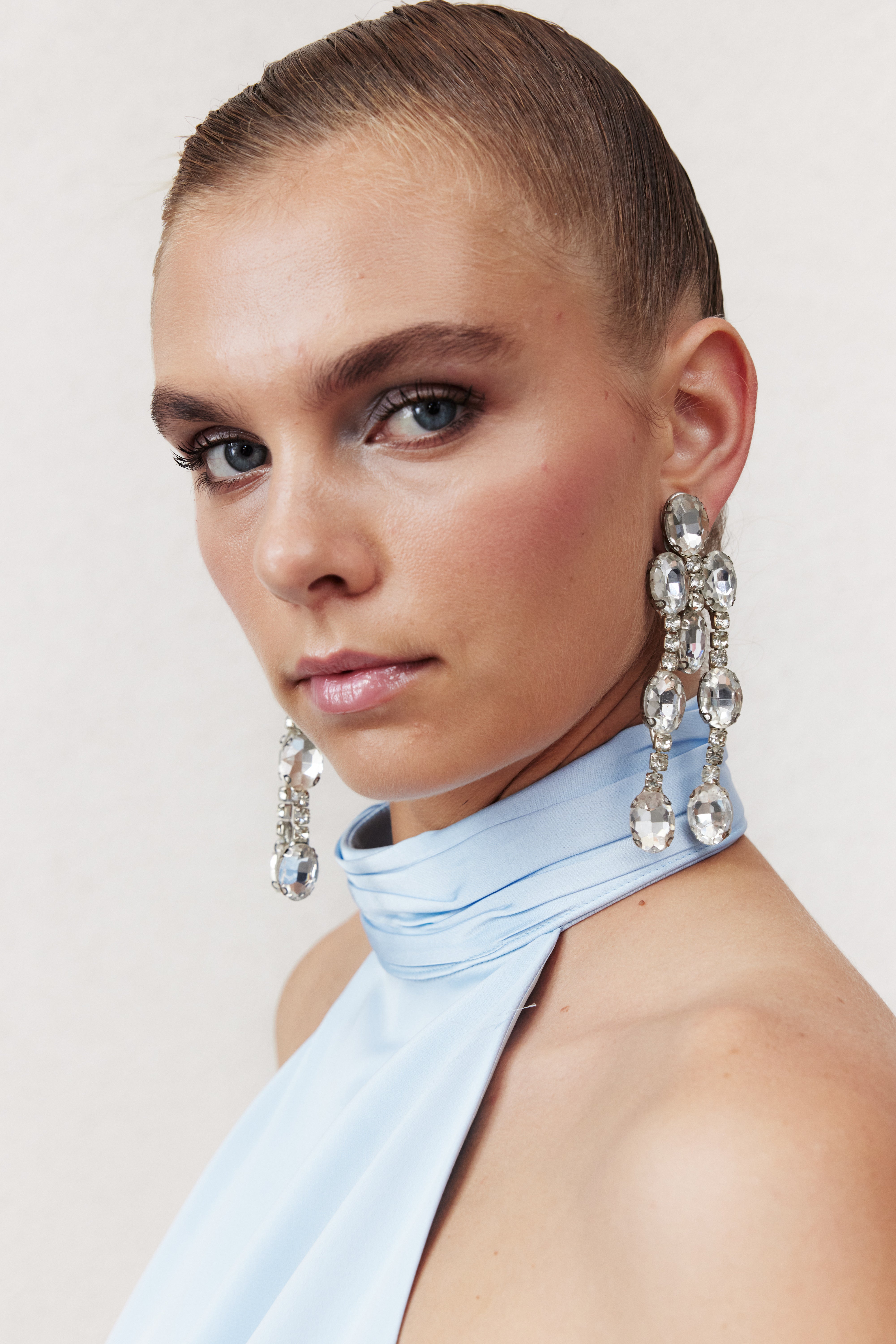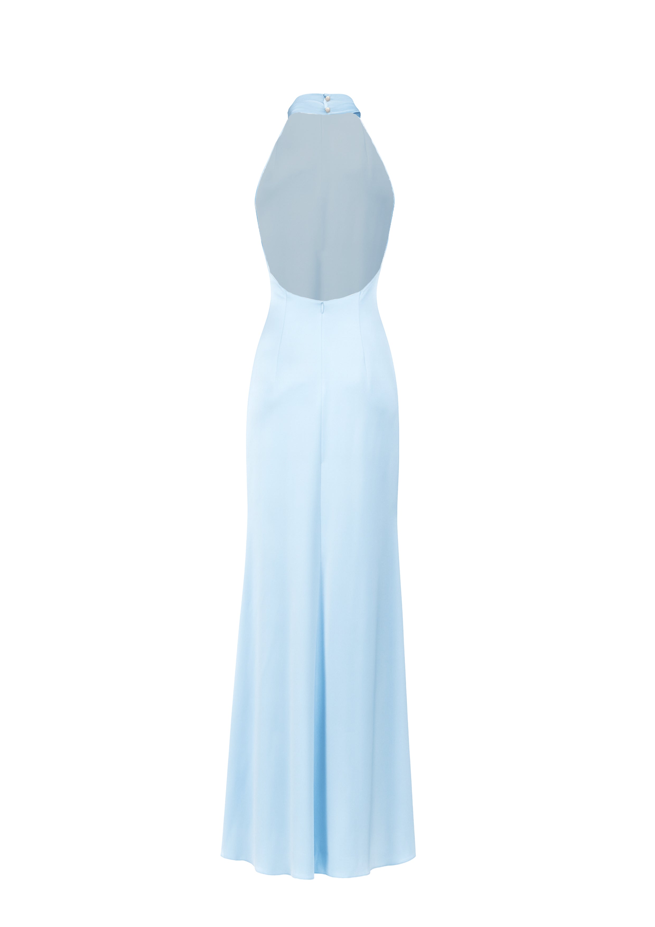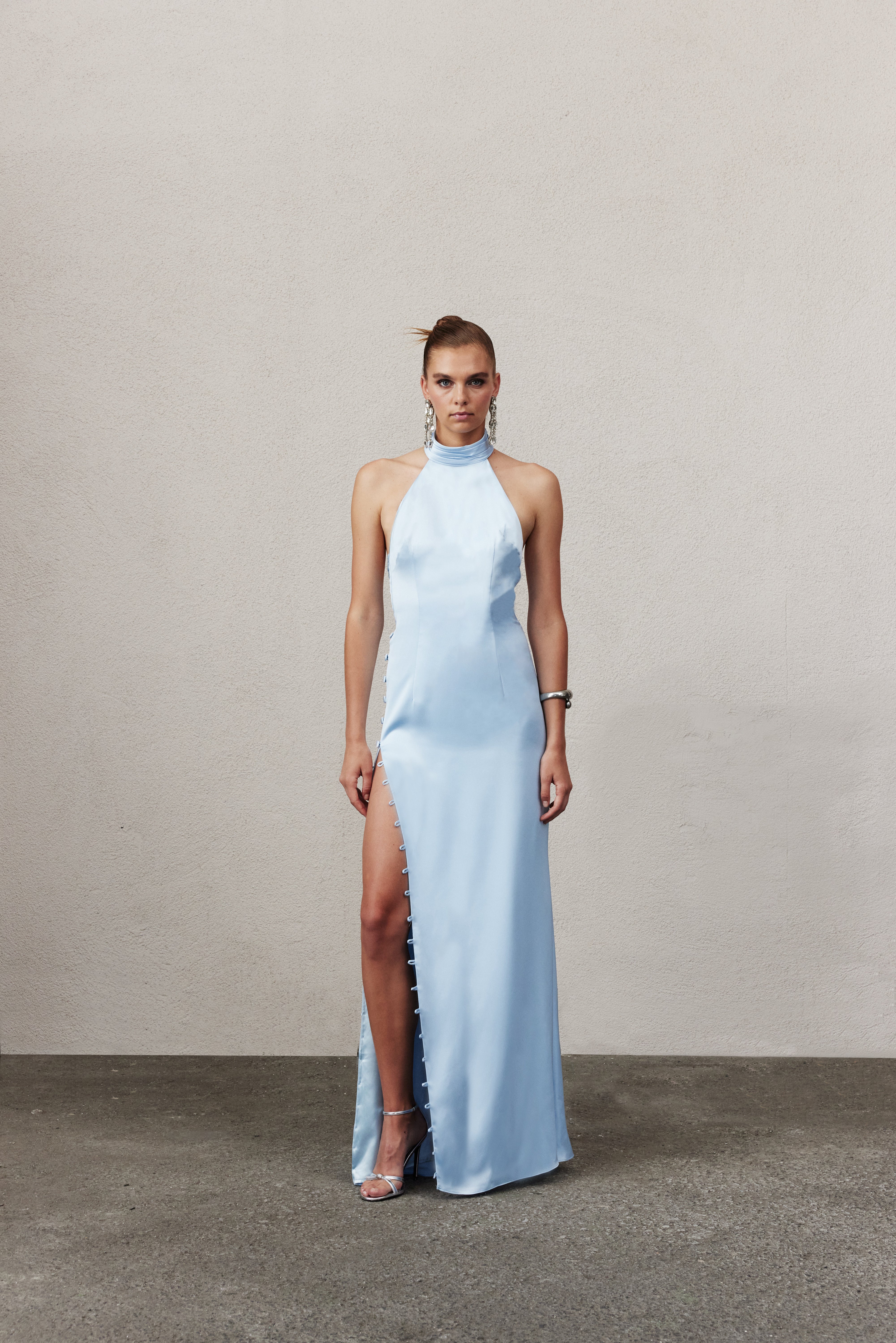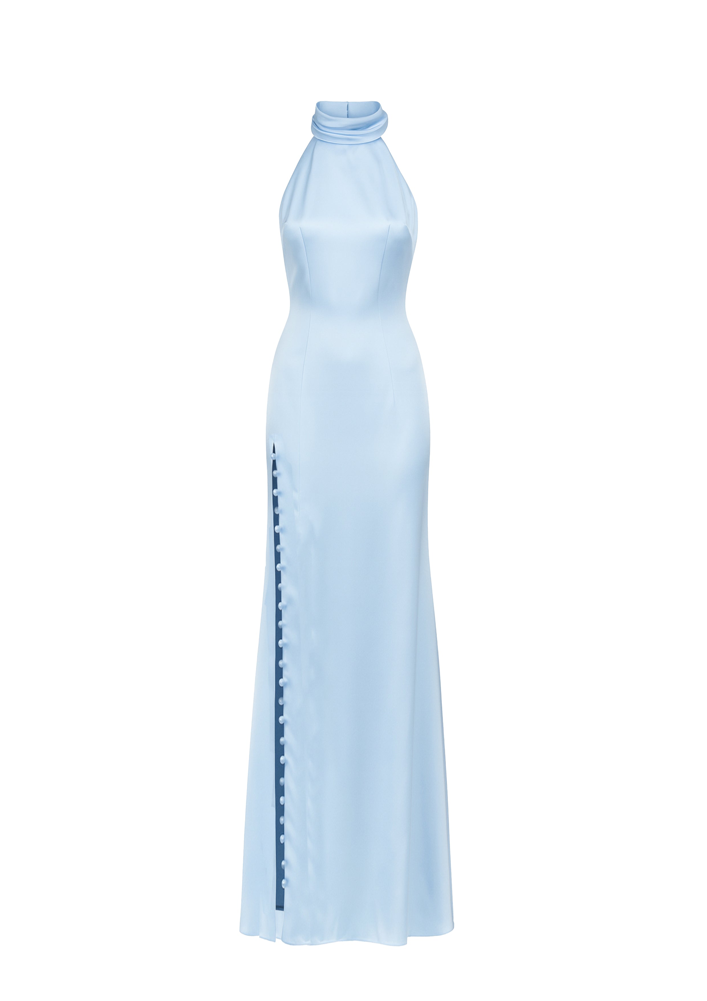 Mallory Elbise, bebe mavisi satenden tasarlanmış olup yüksek yaka ve açık sırt detayıyla zarafet ve çekiciliği dengeler. Yere kadar uzanan silüeti, yan yırtmaç ve üzerindeki kaplanmış düğmelerle modern ve sofistike bir dokunuş kazanır. Akşam davetleri için şık bir seçenektir.
