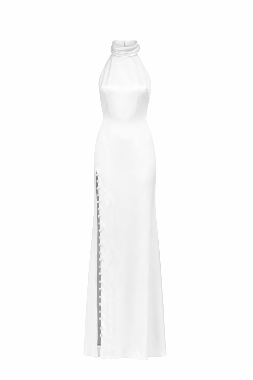 Mallory Elbise, beyaz satenden tasarlanmış olup yüksek yaka ve açık sırt detayıyla zarafet ve çekiciliği dengeler. Yere kadar uzanan silüeti, yan yırtmaç ve üzerindeki kaplanmış düğmelerle modern ve sofistike bir dokunuş kazanır. Akşam davetleri için şık bir seçenektir.