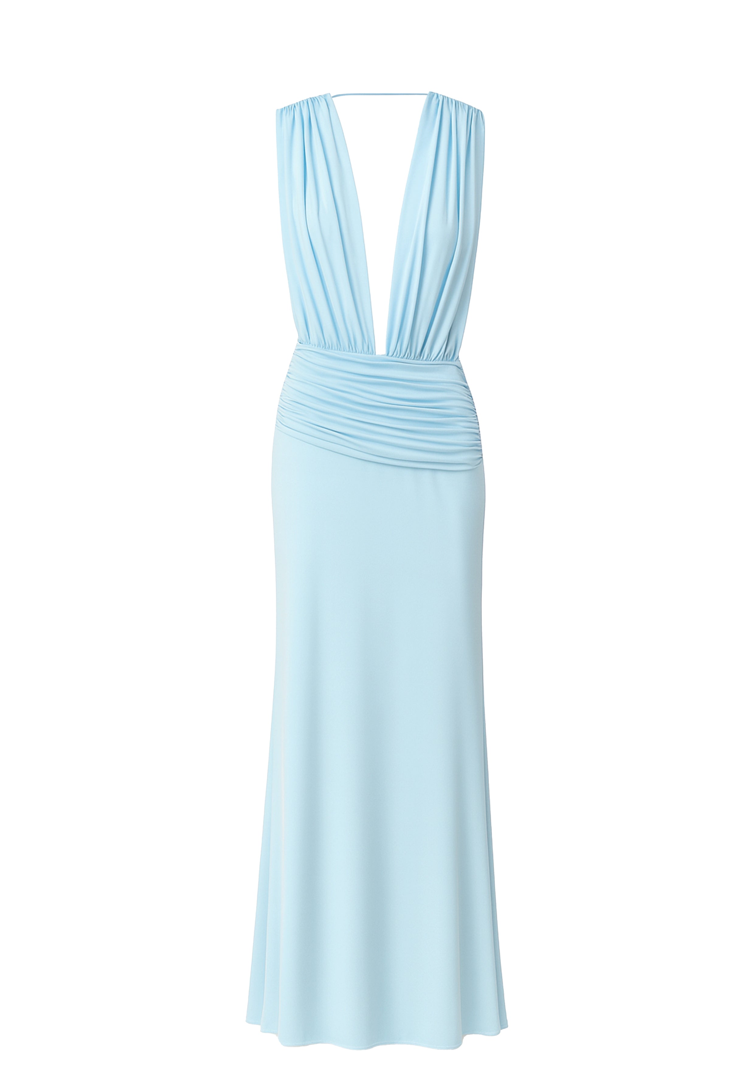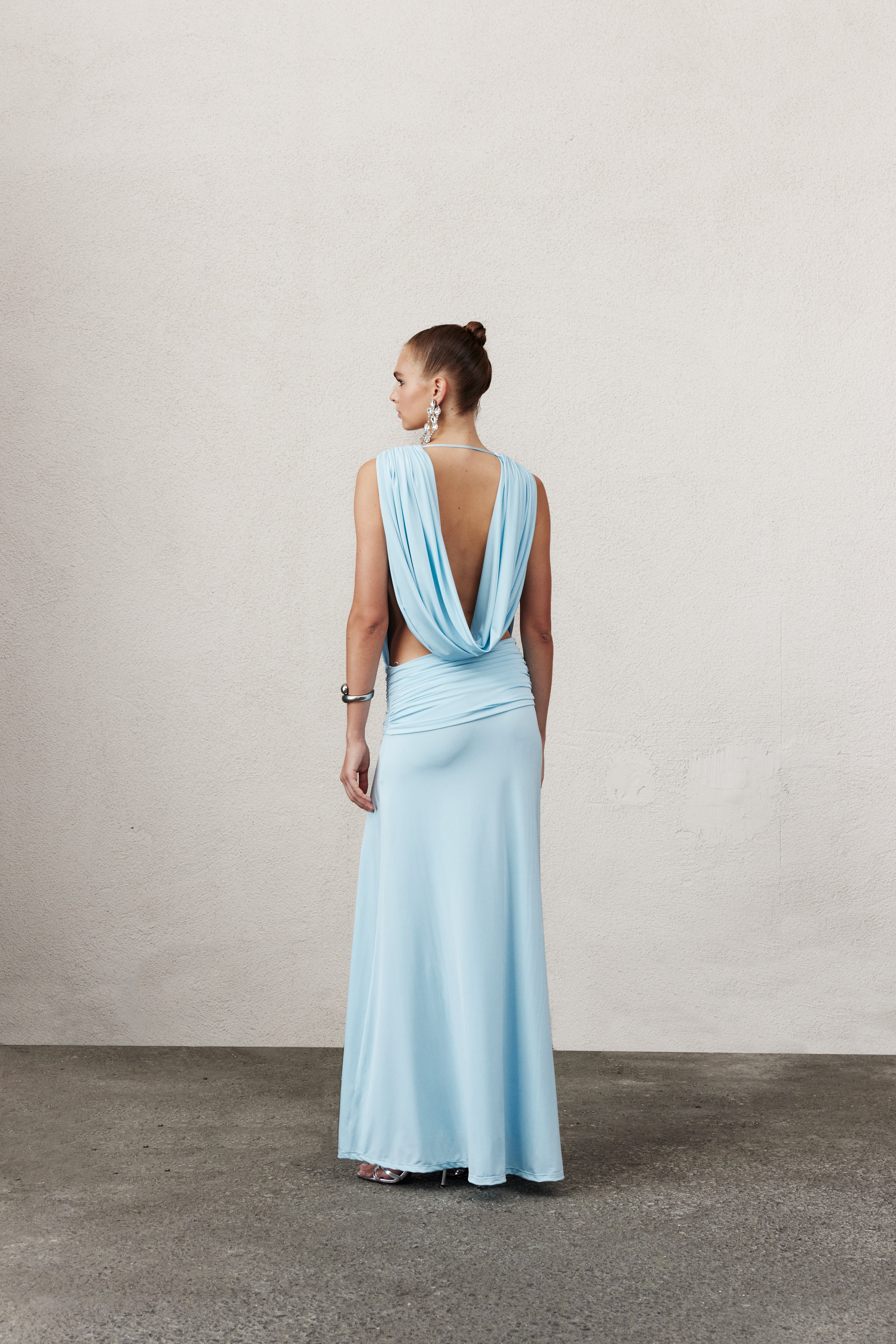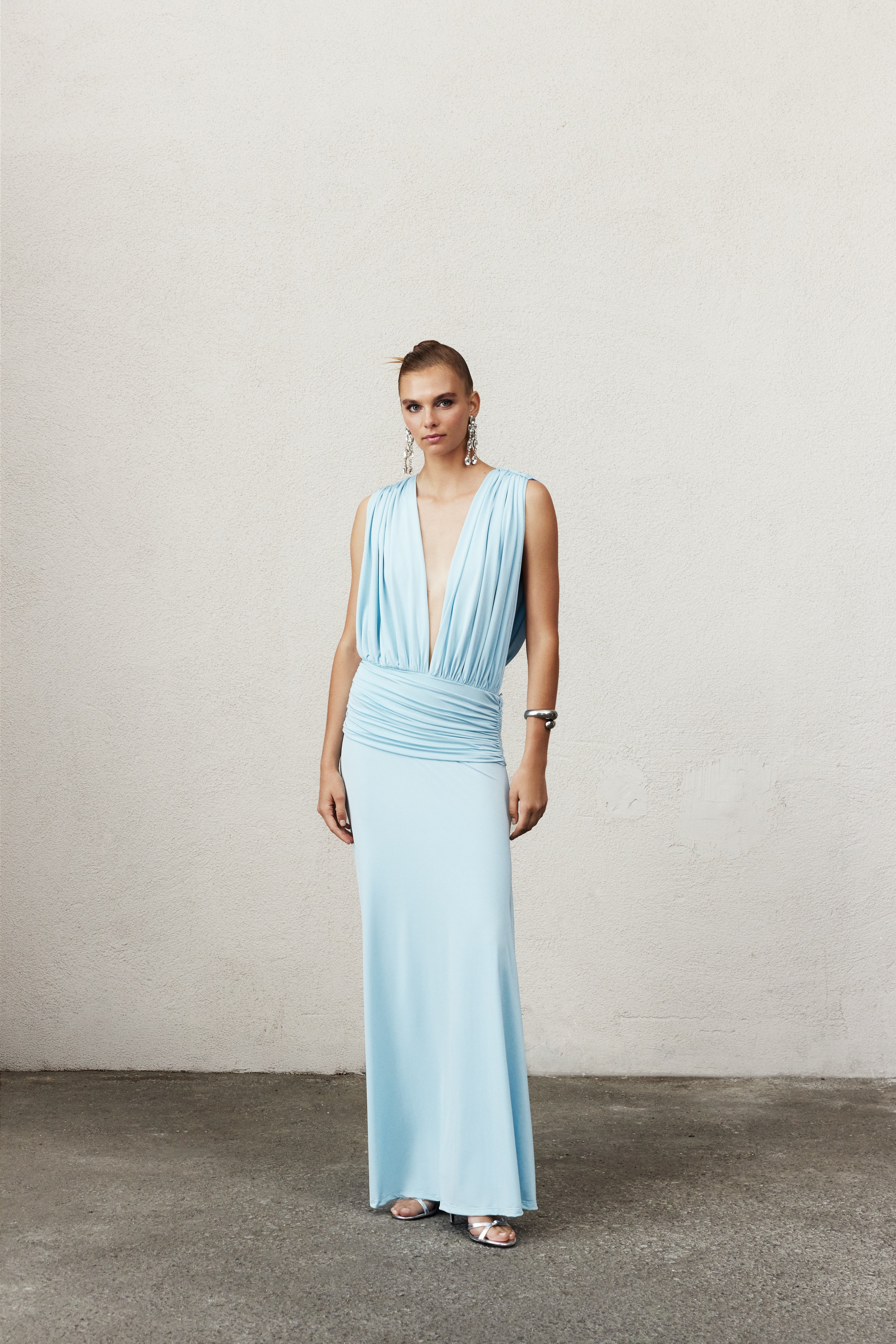 Vivienne Elbise, bebe mavisi jarse kumaştan üretilmiş olup derin bir yaka kesimine ve bel kısmında asimetrik büzgü detaylarına sahiptir. Akıcı silüeti bedeni zarifçe sararken hem rahatlık hem de şıklık sunar. Feminenliği modern bir rahatlıkla dengeleyen tasarım.