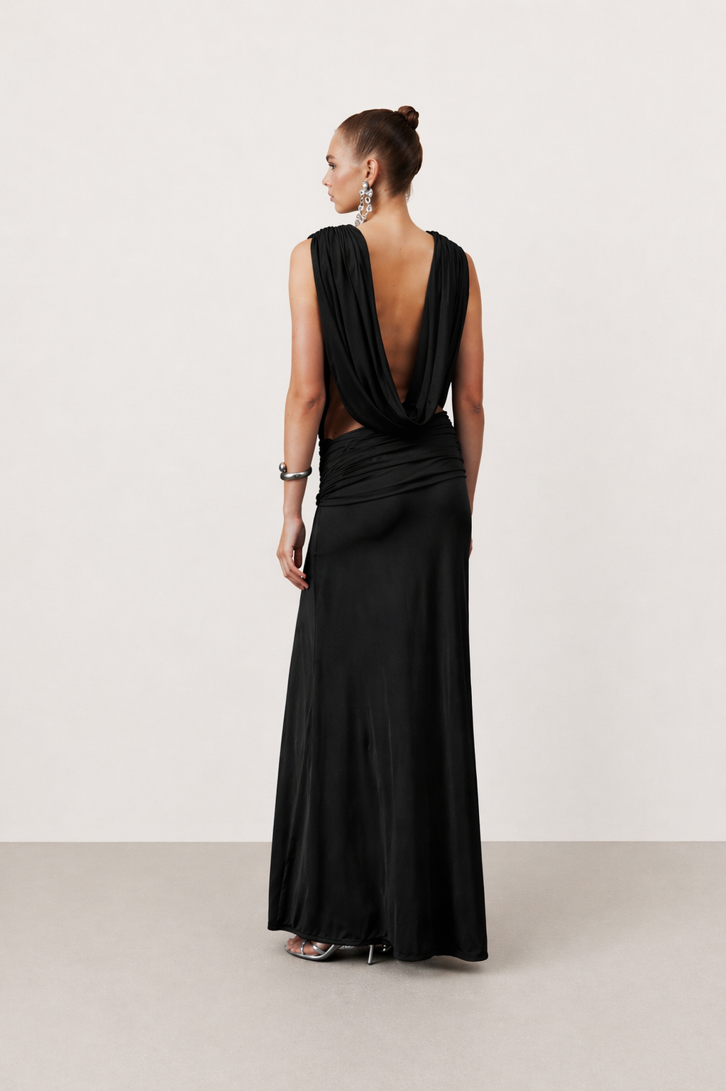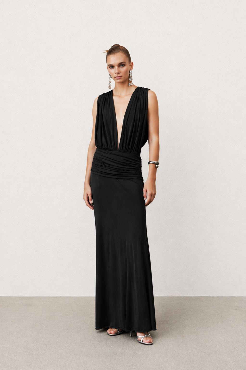 Vivienne Elbise, premium siyah jarse kumaştan üretilmiş olup derin bir yaka kesimine ve bel kısmında asimetrik büzgü detaylarına sahiptir. Akıcı silüeti bedeni zarifçe sararken hem rahatlık hem de şıklık sunar.