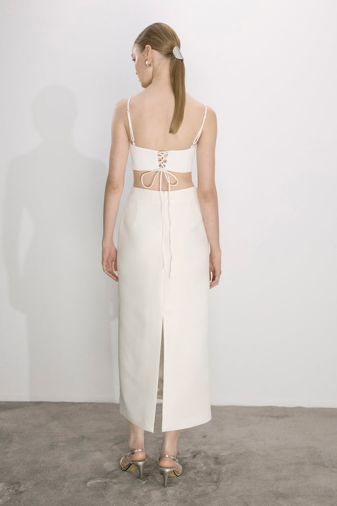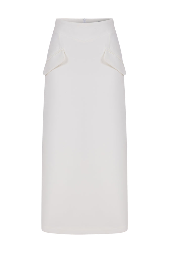 Aveline Etek, vanilya tonunda mat saten kumaştan üretilmiştir. İki yanda fileto cepleri ve şık duruşuyla zamansız bir görünüm sunar. Boxy Cropped Ceket ile kombinlenebilir.