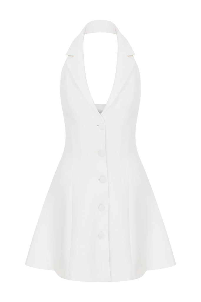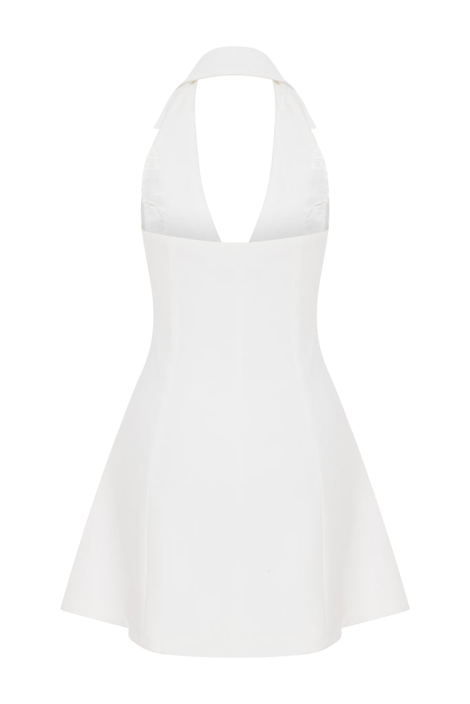 Camille elbise, krep optik beyaz kumaştan üretilmiştir. V yaka tasarımı, boyun bölgesini zarif bir şekilde açarken, boyundan bağlama detayı elbisenin şıklığını artırır. Öndeki düğme detayları, elbisenin estetik bütünlüğünü tamamlar ve ona zarif bir dokunuş katar. Sırtı açık kesimi ise vücut hatlarınızı zarif bir şekilde vurgular.