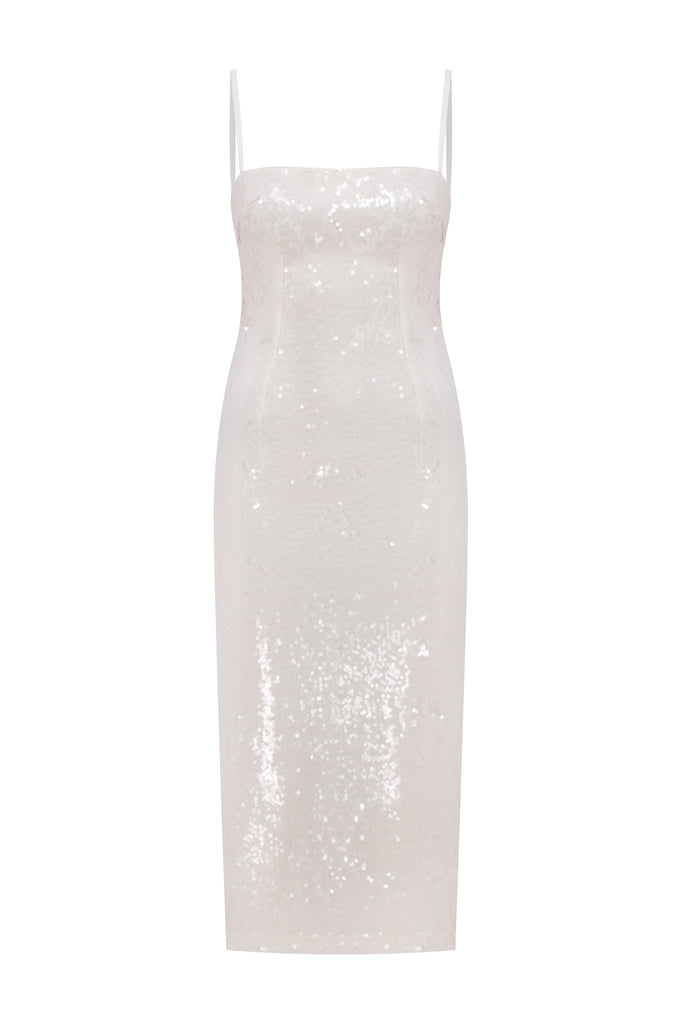 Payetli kumaştan tasarlanan Miles Payet elbise, ince saten askıları ve midi etek boyuyla zarif bir görünüm sağlar.