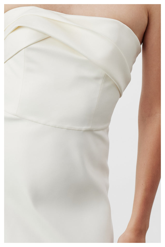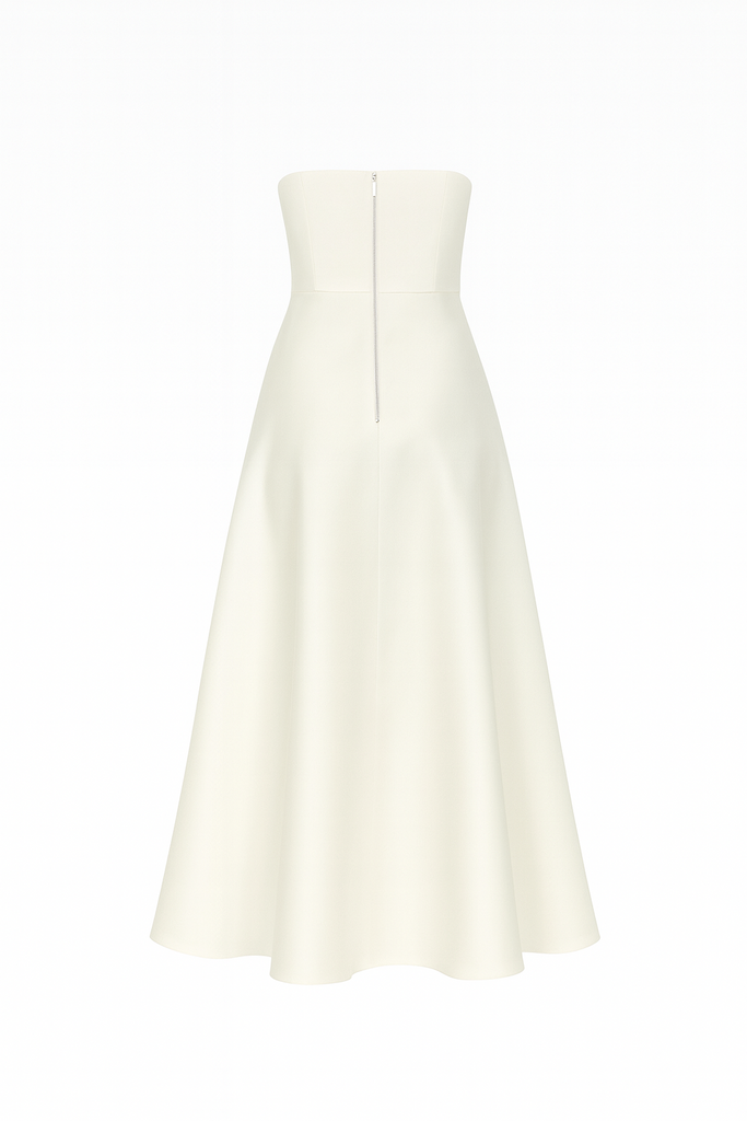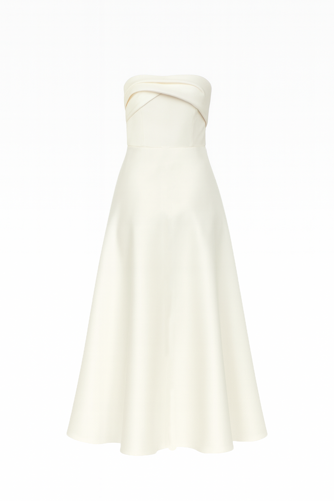 Freya Midi Elbise, gövdeyi saran üst kısmı ve rahat kesim etek yapısıyla zarif bir denge sunar. Tüm elbise kendi kumaşından iki kat olacak şekilde tasarlanmıştır. Göğüs bölümündeki katlama detayı, elbiseye nazik ve özgün bir zarafet katar. Arkadan fermuarlı, straplez tasarıma sahip olan elbise bilek boyundadır. Freya Elbisenin kısa versiyonu da mevcuttur.