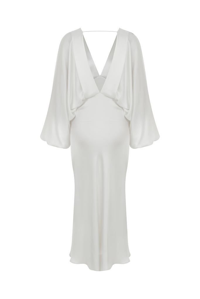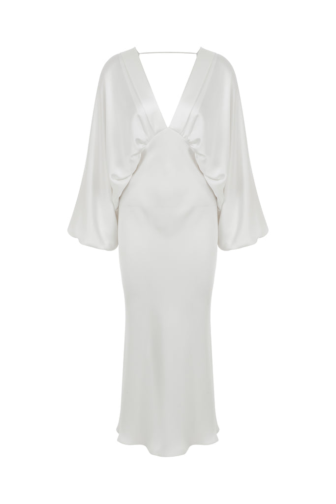 Mila Saten Elbise, zarif bir düğün günü veya özel etkinlik seçeneğidir, derin V yakalı ve V şeklinde sırtlı ile yumuşak satenden üretilmiştir.
