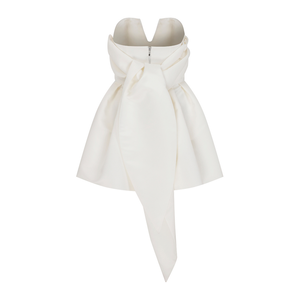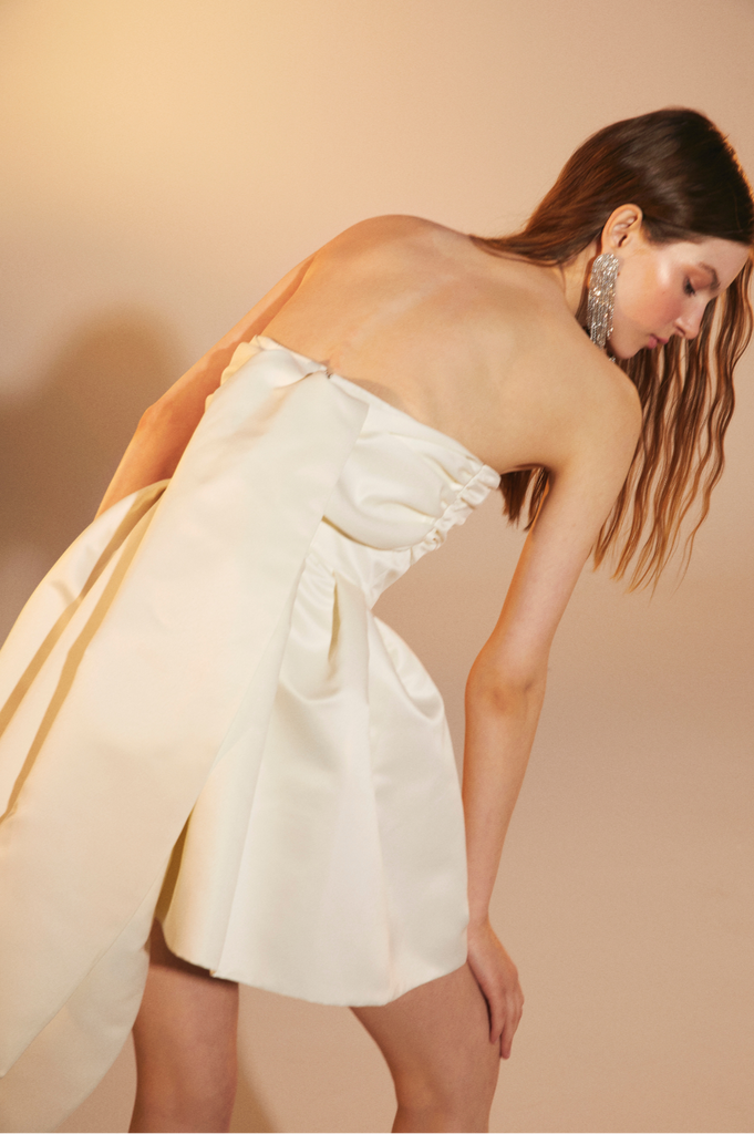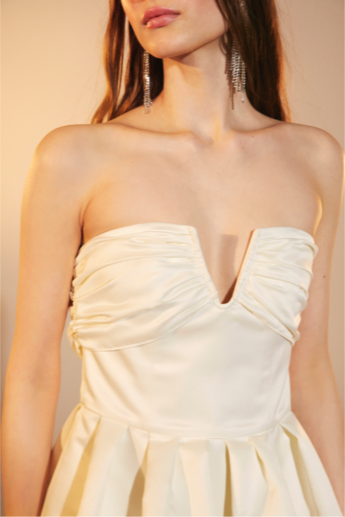 Miro Elbise, beyaz kumaşıyla ve mini boyuyla öne çıkıyor. Göğüste bulunan büzgü detayı ve arkada bağlanan kumaşı, benzersiz bir görünüm sunar. Kabarık eteğiyle hareketlilik kazanan bu elbise, sırtında bulunan fermuar detayıyla kolay giyim sağlar. Düğün ve nikah gibi özel günler için mükemmel bir seçenektir.