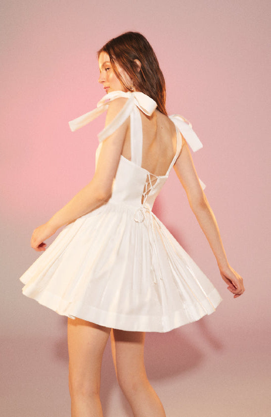 Nazlı Ceren, dökümlü omuz bağcıkları ve büzgülü eteği ile şekillenen bu beyaz, parlak viskon mini elbise ile şiirsel bir nota yakalıyor.