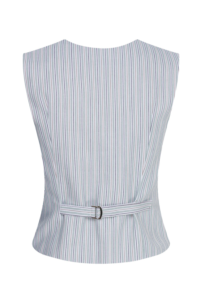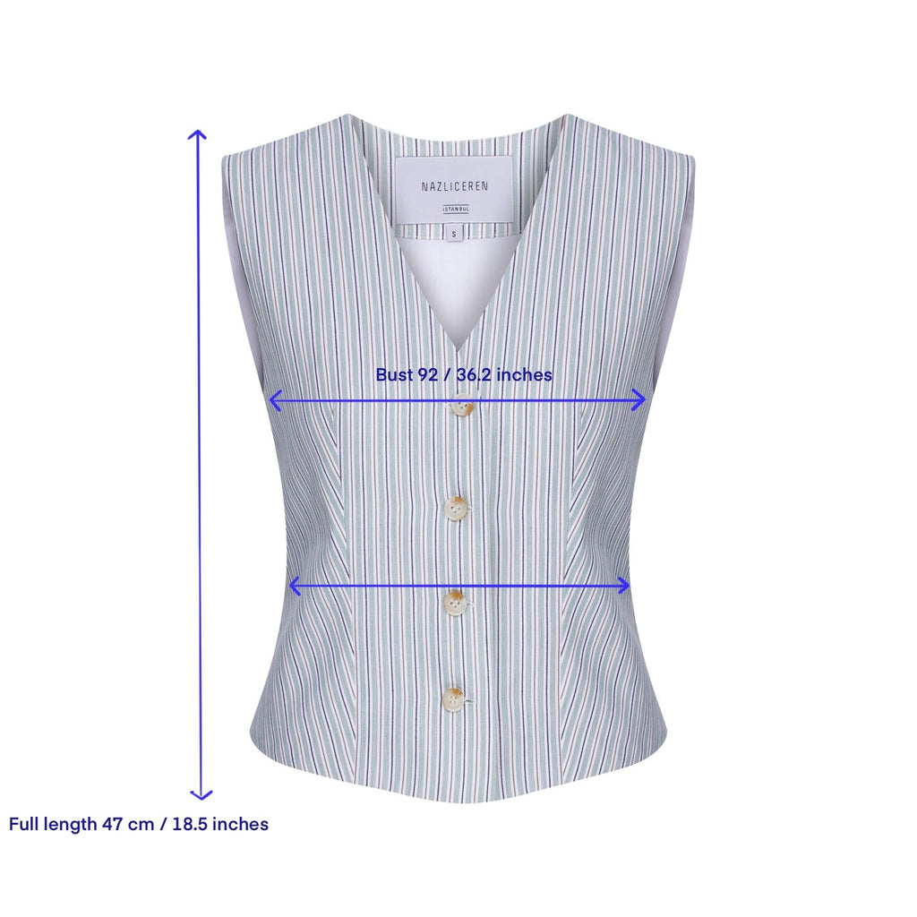 Nazlı Ceren, cinsiyetsiz takım elbiselerden ilham alarak hafif pamuktan dikilmiş pensleri ve ayarlanabilir sırt askısıyla bu çizgili Brita yeleği tasarladı.