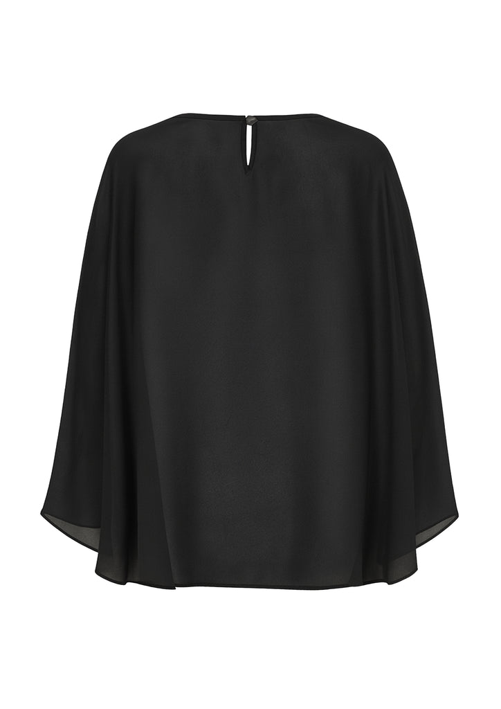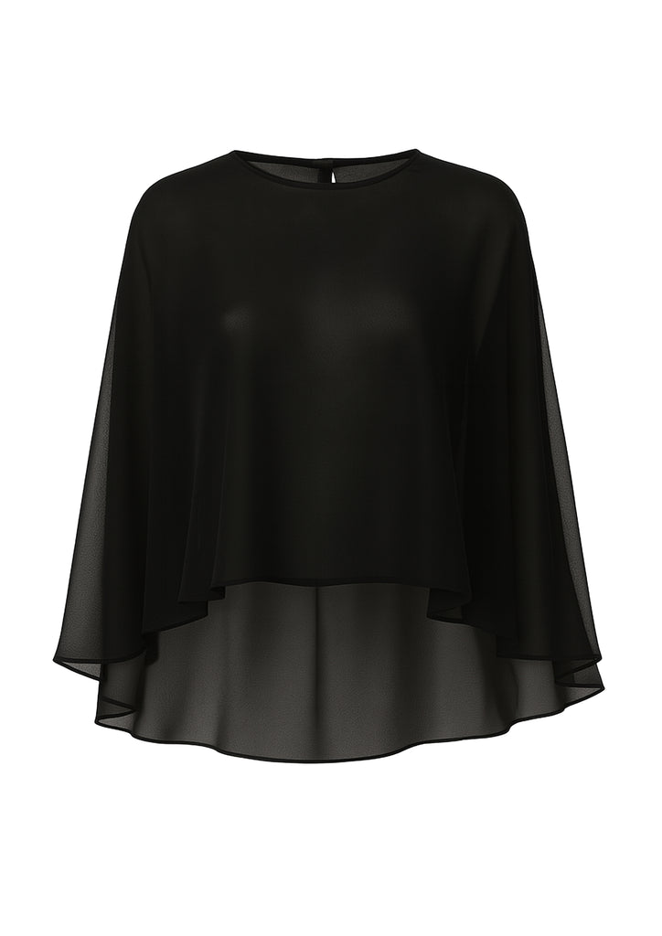 Viona Cape, siyah şifon kumaşı ve ince dökümlü yapısıyla zarif bir şıklık sunar. Önü kısa, arkası hafif daha uzun tasarımıyla modern bir silüet oluşturur. Büstiyer ve crop parçalarla mükemmel şekilde kombinlenebilir.