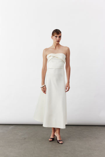 Freya Midi Elbise, gövdeyi saran üst kısmı ve rahat kesim etek yapısıyla zarif bir denge sunar. Tüm elbise kendi kumaşından iki kat olacak şekilde tasarlanmıştır. Göğüs bölümündeki katlama detayı, elbiseye nazik ve özgün bir zarafet katar. Arkadan fermuarlı, straplez tasarıma sahip olan elbise bilek boyundadır. Freya Elbisenin kısa versiyonu da mevcuttur.